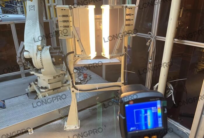 在待折彎的熱塑性預浸料板上進行紅外線快速預熱軟化,雙面加熱,以達到折彎所需工藝要求。利用線型聚焦加熱器(加熱器聚集成一條高溫加熱線)的低能耗,高光強,穿透力強,控制簡單等特點,通過上下布置,快速精準軟化所需的狹長區域,尤其帶有厚度的預浸料折彎加工。